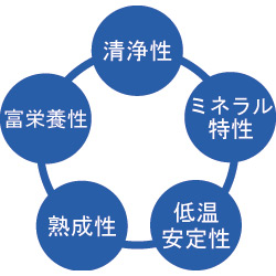 真っ暗闇の深海では太陽の光の影響を受けることなく、表層水と比べて水温はかなり低く(約5℃)一年中ほとんど変化しないため、清浄さを保ち、とても安定しています。